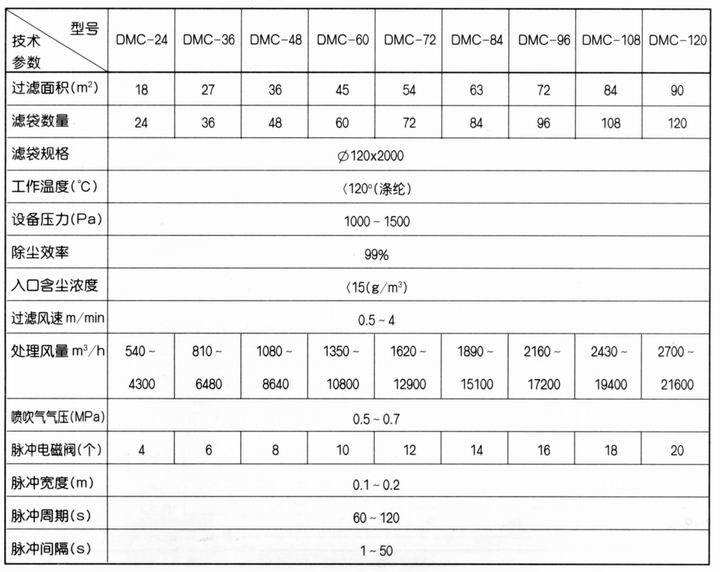 DMC型脈沖袋式倉頂除塵器 DMC型脈沖袋式倉頂除塵器適宜布置在各種粉料貯存庫的頂部,用于捕集各種細(xì)小干燥非纖維粉塵。 主要技術(shù)參數(shù): DMC型脈沖袋式倉頂除塵器主要技術(shù)參數(shù)見表,在選型時(shí)應(yīng)注意入口粉塵濃度,在技術(shù)性能上,透過濾袋的氣流速度(即過濾風(fēng)