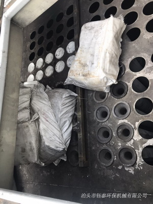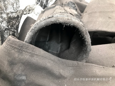 除塵器使用地點(diǎn):寧夏石嘴山,除塵濾袋使用壽命:3年,除塵濾袋規(guī)格:500g滌綸針刺氈,粉塵類(lèi)型:黑砂,粉塵特性:粗粉塵、濕度大,干燥時(shí)會(huì)變成固體并粉碎,工作溫度:低于60℃除塵器吸風(fēng)口處有一個(gè)除塵濾袋在袋口損壞,濾布完全成了黑色,由于缺少一個(gè)濾袋