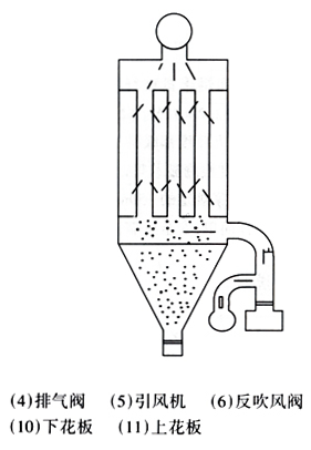 該除塵設(shè)備由含塵氣體入口至凈化煙氣出口,本體結(jié)構(gòu)由進氣管路、進氣室、袋室、灰斗、排灰閥、出口管道及反吹風(fēng)系統(tǒng)和清灰控制系統(tǒng)所組成。